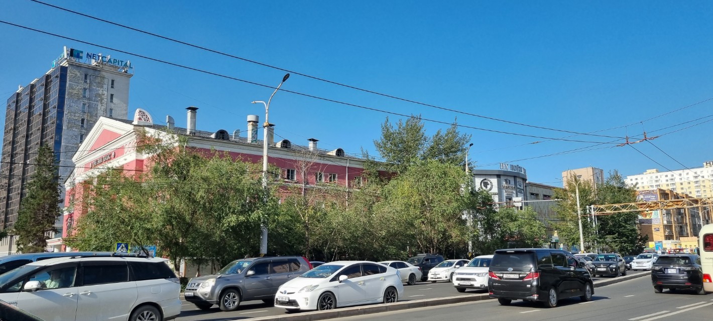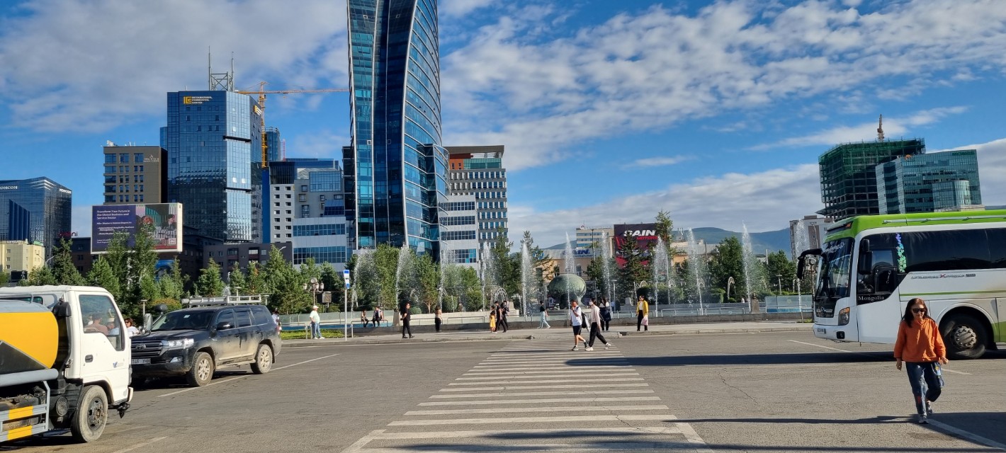 분수광장... 광장 앞에는 블루 스카이 타워라는 이름의 돛 형태의 커다란 빌딩이 있는데, 이 건물은 몽골에서 제일 높은 빌딩(105m)이다. 한국인이 100% 투자해서 만든 것이다. 다만 빌딩 소유자는 몽골 사업에서 손을 뗀 상태라고. 이후 몽골 기업인 초노 코퍼레이션(Chono Corporation)에서 운영하고 있으며, 5성급 호텔인 '블루 스카이 호텔(Blue Sky Hotel)'이라는 이름으로 운영 중에 있다. 한국인이 만든 건물이라서 그런지 한국식 커튼 웰로 마감해 익숙한 건물 풍경이다.
