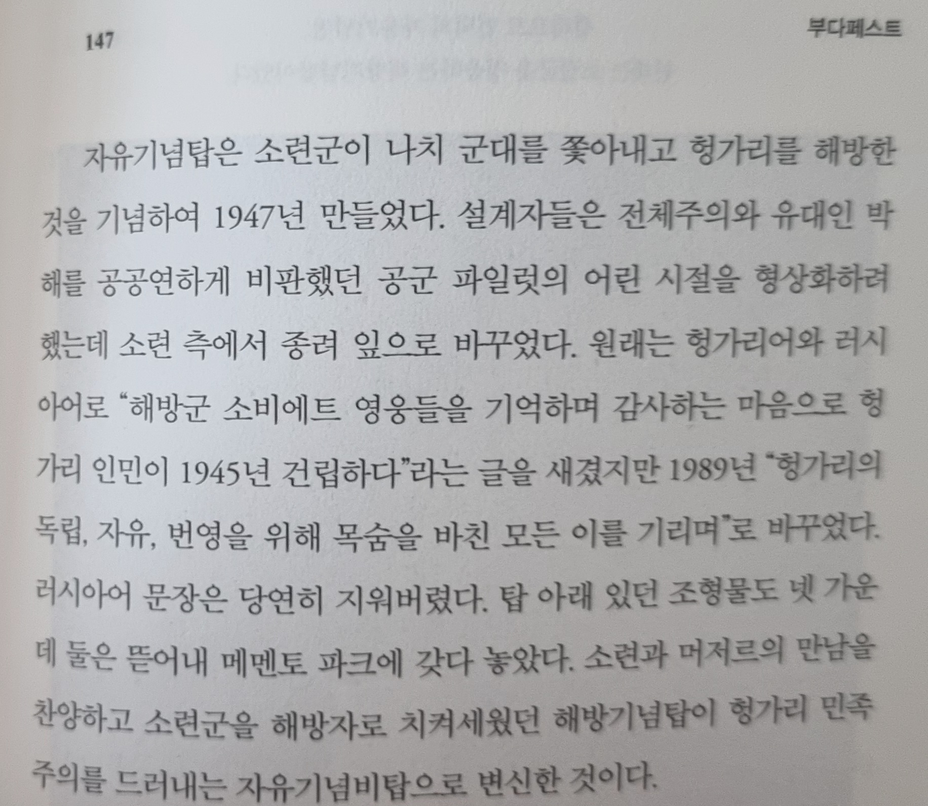☞ 그 이유를 얼마전에 유시민 작가의 "유럽도시기행 2"를 읽고서 알게 되어 추가로 언급을 해 보면 자유기념탑은 소련군이 나치 군대를 쫓아내고 헝가리를 해방한 것을 기념하여 1947년에 만든 것이고 소련에 의한 공산독재는 그 이후의 일이다.